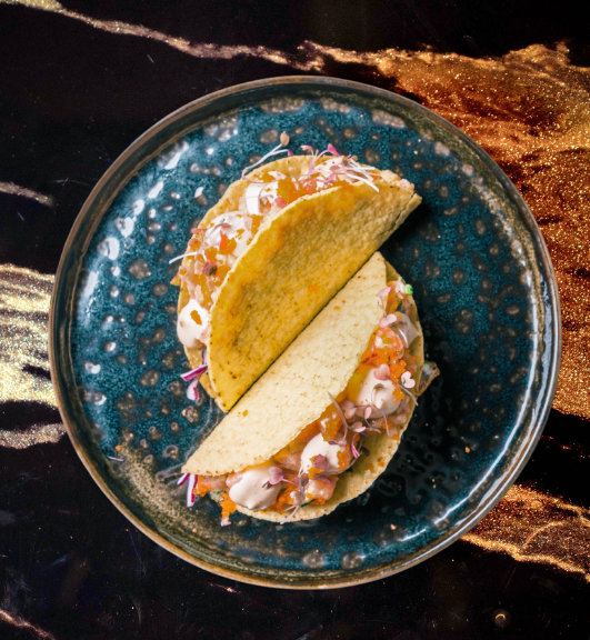 2 Tacos di farina di mais, pesce misto, salsa guacamole, cavolo verza e coriandolo.
